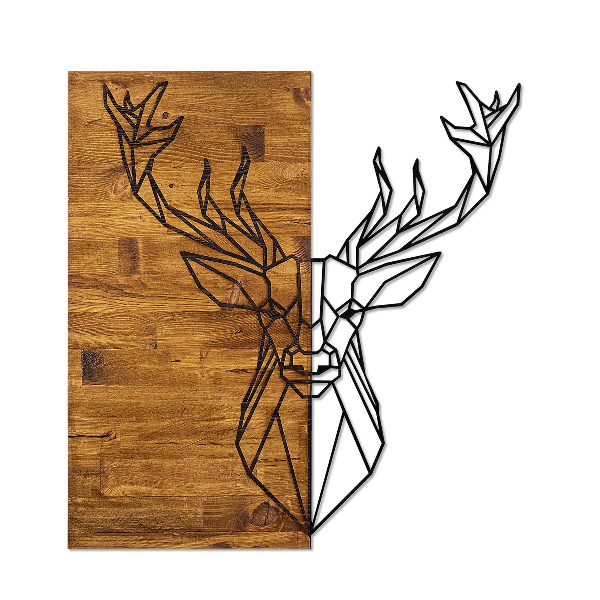 Een stijlvolle eyecatcher voor je interieur! Deze hertenkop combineert zwart metaal en warm walnotenhout, waardoor hij zowel stoer als sfeervol oogt. Perfect voor boven de bank, in de hal of als decoratief accent in een modern of landelijk interieur.