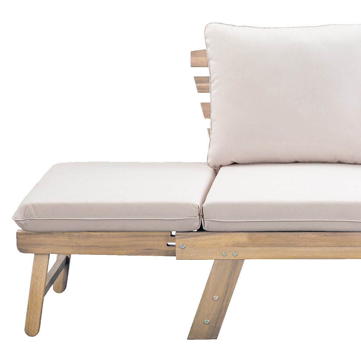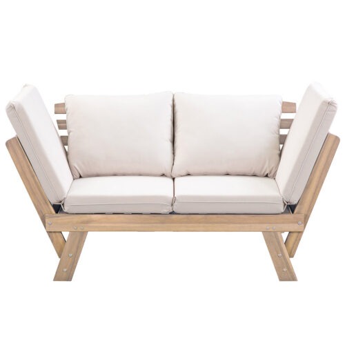 Flexibel comfort met een natuurlijke uitstraling. Deze uitklapbare 2-zits zitbank combineert warm hout met zachte stoffering en is ontworpen om zich moeiteloos aan te passen aan jouw moment. Gebruik hem als comfortabele bank of klap hem uit tot een royale ligstoel van 2 meter breed. Ideaal om te ontspannen, samen te loungen of even languit te genieten. De inklapbare armleuningen vergroten de flexibiliteit, terwijl de twee losse rugkussens en het gestoffeerde zitkussen (uit één geheel) zorgen voor aangenaam zit- en ligcomfort. Een doordacht ontwerp dat functionaliteit en rust samenbrengt, passend binnen zowel een natuurlijk interieur als een overdekte buitenruimte.